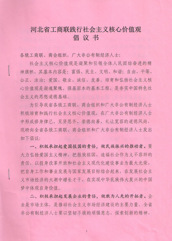 河北省工商聯踐行社會主義核心價值觀倡議書