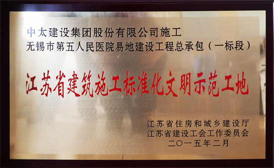近日,由江蘇省住建廳傳來(lái)喜訊,由中太建設(shè)集團(tuán)承建、無(wú)錫分公司施工建設(shè)的無(wú)錫市第五人民醫(yī)院易地建設(shè)一標(biāo)段施工總承包工程,榮獲2014年下半年度“江蘇省建筑施工標(biāo)準(zhǔn)化文明示范工地”稱號(hào)。