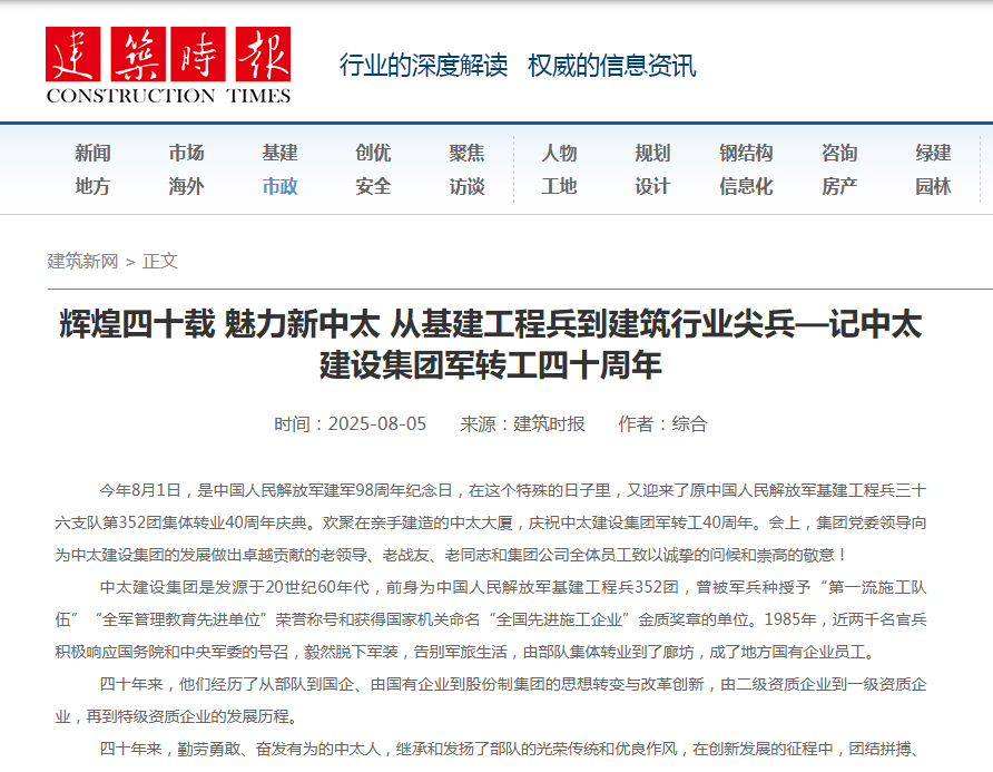 建筑時(shí)報(bào)8月5日?qǐng)?bào)道了輝煌四十載 魅力新中太 從基建工程兵到建筑行業(yè)尖兵——記中太建設(shè)集團(tuán)軍轉(zhuǎn)工四十周年