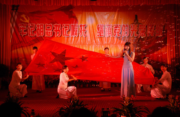 廊坊師范學院喬一風雨同舟組合和中太員工為大會獻上精彩的文藝表演,《情系人民》、《黨旗下中太人》、《繡紅旗》、《我愛你中國》等一個個主題鮮明的節目,充分展示了同學們及中太員工以飽滿的政治熱情,創作、排演了形式多樣、思想深刻、藝術精湛的文藝節目;一首首耳熟能詳的歌曲,一個個真切感人的節目,讓在場的每一位觀眾、都感受到同學們對災區人民的真切關愛之情。歌聲似春潮涌動,掌聲如林濤和鳴,大會在《明天會更好》嘹亮的歌聲中圓滿結束。集團領導觀看了演出并上臺接見演職人員,同他們合影留念。