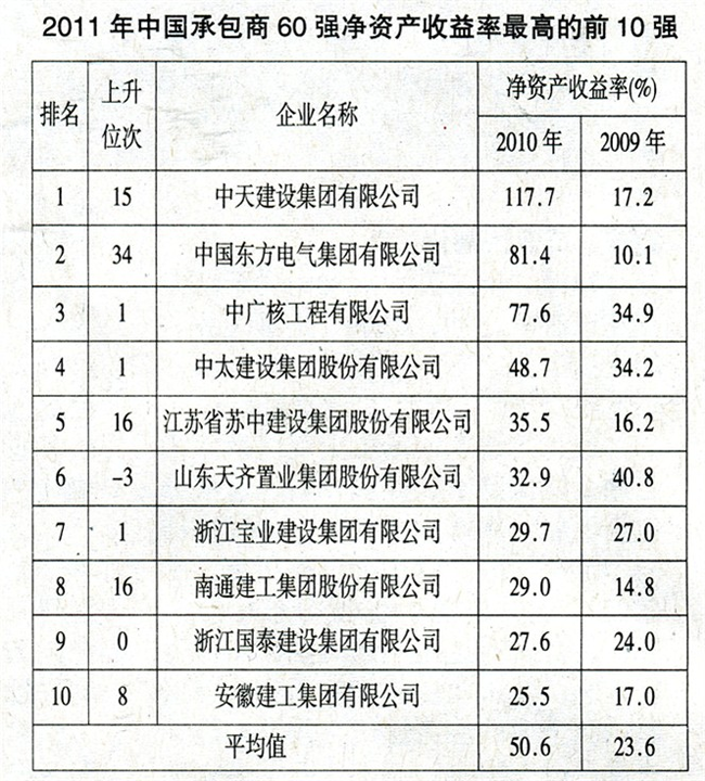 2011ENR/建筑時報(bào)“中國承包商和工程設(shè)計(jì)企業(yè)雙60強(qiáng)”榜單于11月16日正式發(fā)布。中太建設(shè)集團(tuán)以2010年48.7%的凈資產(chǎn)收益率排名中國承包商60強(qiáng)第四位,較2009年34.2%的比率,排名上升了一位。