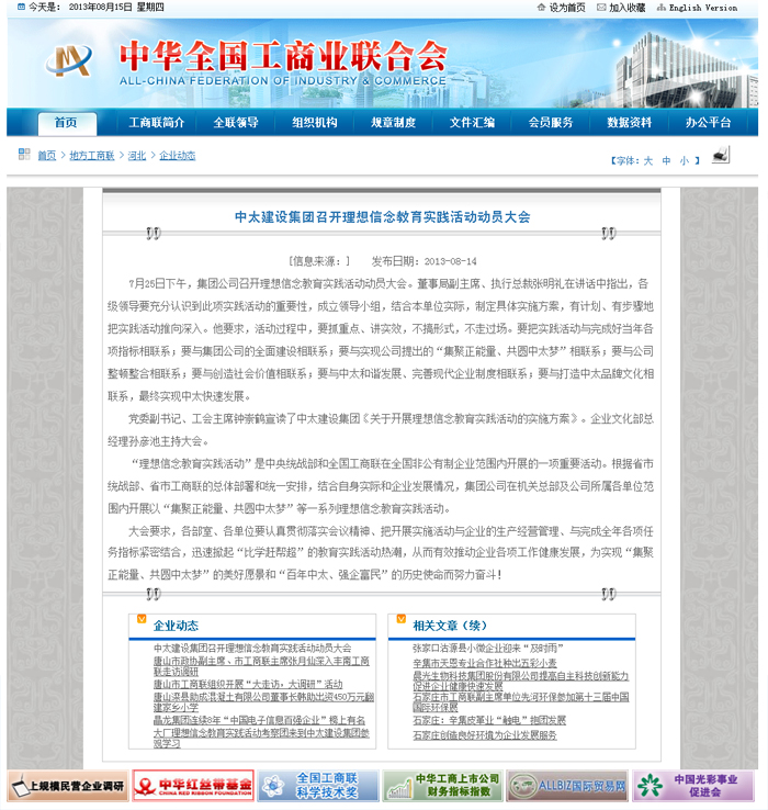 全國工商聯(lián)網(wǎng)站8月14日報(bào)道了中太建設(shè)集團(tuán)召開理想信念教育實(shí)踐活動動員大會