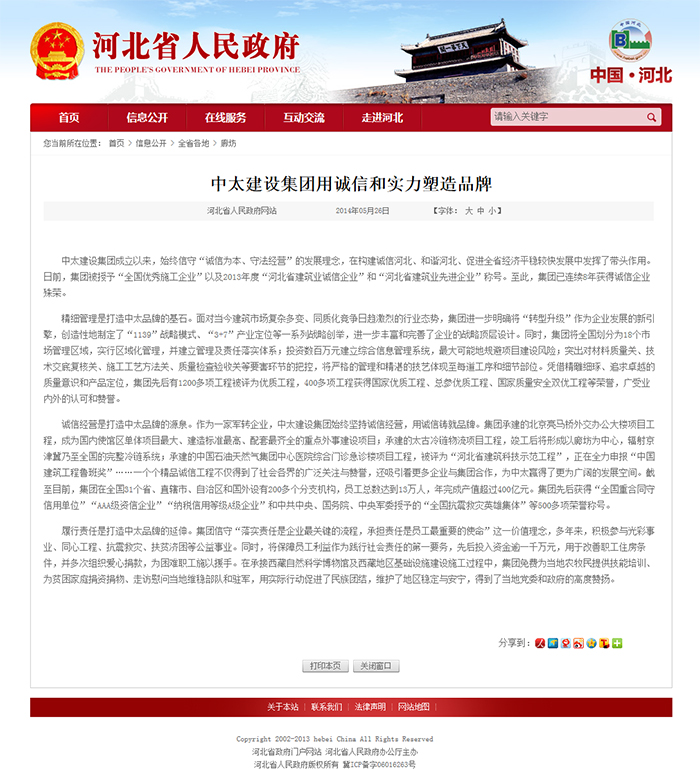 河北人民政府網(wǎng)站報道了中太建設(shè)集團用誠信和實力塑造品牌