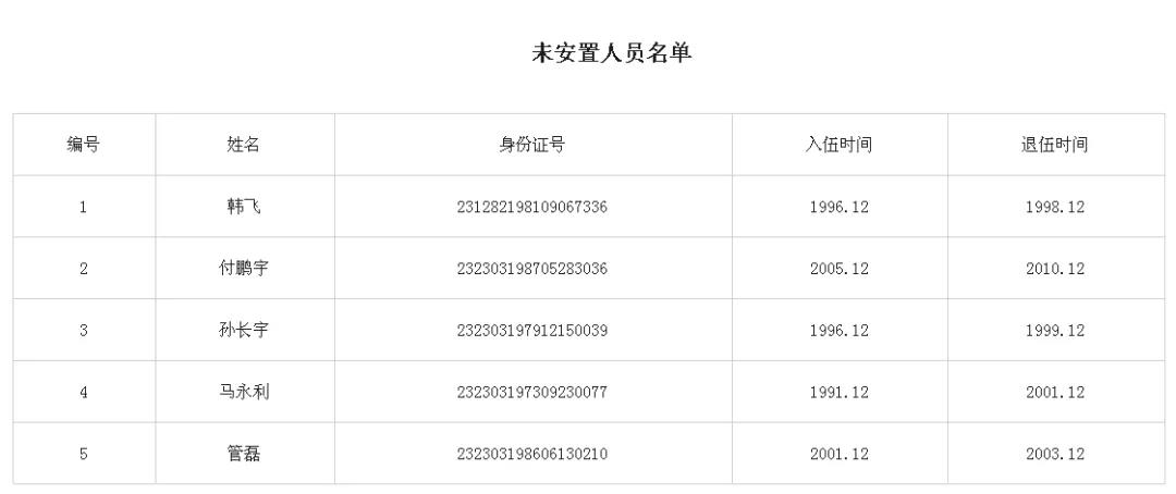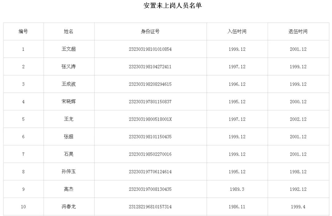 以上人員請于2020年12月31日前,持本人身份證、退伍證原件、檔案由本人保管的提供原件,到肇東市退役軍人事務局二樓移交安置股辦理安置上崗相關手續,在規定時間未報到的按自動放棄處理。