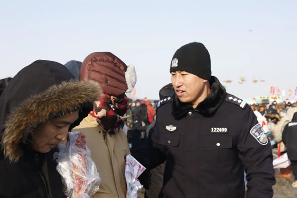 由于捕魚時湖面上打下了很多“冰眼”,為了防止群眾距離出魚口過近掉入“冰眼”,執(zhí)勤民警合力將“冰眼”守護(hù)起來,疏導(dǎo)圍觀群眾保持安全距離。執(zhí)勤過程中,民警們不畏嚴(yán)寒、頑強(qiáng)作戰(zhàn),組織、疏導(dǎo)現(xiàn)場群眾有序觀看捕魚,有效防止了意外事故的發(fā)生。
