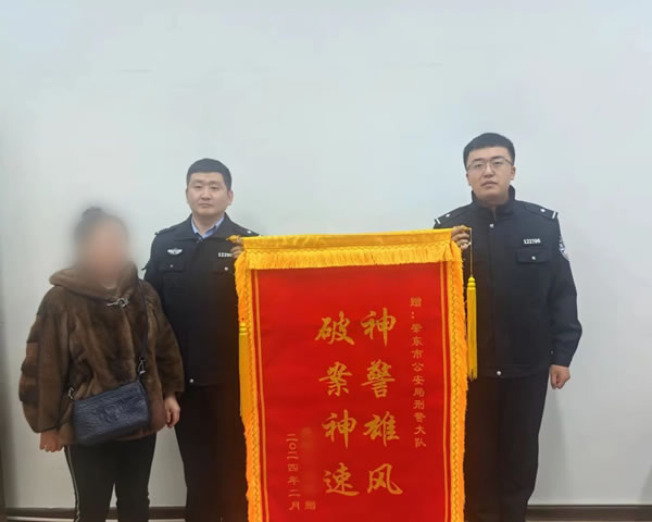 在“春雷行動”中,肇東市公安局刑警大隊緊盯重案、要案,采取快偵、速破原則,成功偵破一起持刀搶劫案手機案,贏得了轄區居民的一致好評。2月18日,肇東市居民劉女士,將一面印有“神警雄風 破案神速”的錦旗,送到肇東市公安局刑警大隊民警手中,以表感激之情。