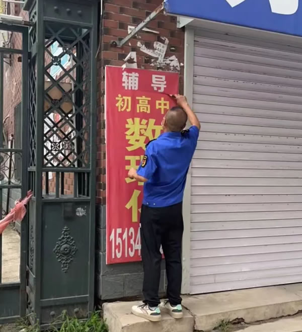 在檢查中,檢查組發(fā)現(xiàn)一家機(jī)構(gòu)墻板有學(xué)科類字樣,當(dāng)即下發(fā)限期整改通知書,要求立行立改;同時(shí),對2家懸掛違規(guī)牌匾的機(jī)構(gòu),綜合執(zhí)法局工作人員予以了當(dāng)即拆除。
