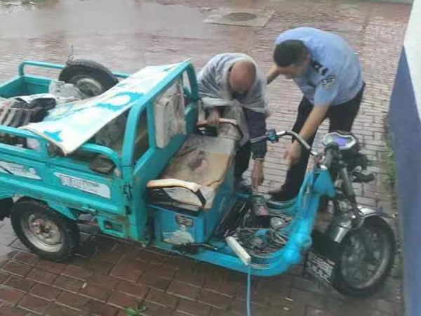了解情況后,民警冒著大雨幫助遲大哥把沒電的三輪車推到派出所院內進行充電,并將遲大哥邀請到派出所屋內,順便避一避雨,為其購買了蛋糕火腿腸等食品,并為其提供了熱水,緩解了遲大哥瑟瑟發抖的身體,遲大哥激動地說“今天要是沒有你們我肯定回不了家了,能真心幫助我的好心人也只有派出所了……”遲大哥不斷感謝派出所民輔警。
