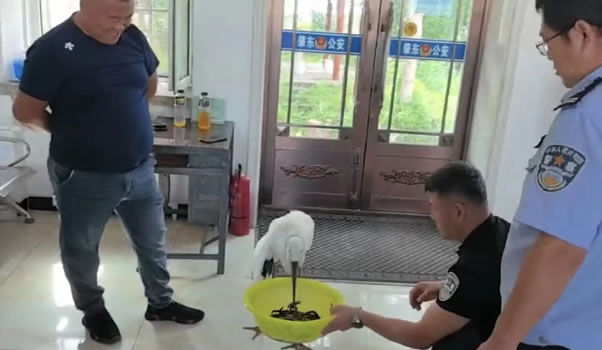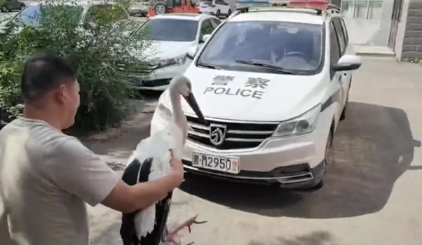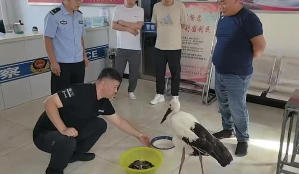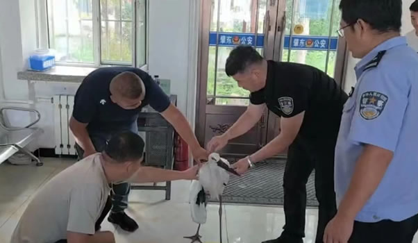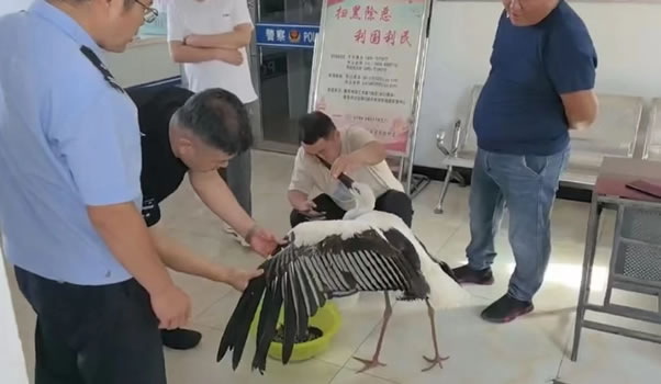 8月28日,躍進鄉福龍村書記宋健來到肇東市公安局躍進派出所,稱在躍進鄉福龍村新發屯草甸子上發現一只大鳥晃晃蕩蕩落在草甸子上,不斷哀鳴。大鳥體長120厘米左右,身上大部分呈白色,翅膀下方呈黑色,嘴部呈黑色,嘴的基部較厚,往尖端逐漸變細,并且略微向上翹,前頸的下部有呈披針形的長羽,腿部較長。但他一下子想不起來鳥的名字,只是知道它應該是保護動物,因此請求派出所進行救助。宋健介紹不知為什么,發現時這只大鳥不飛、不動,行動遲緩,也不曾進食,走上前也不怕,站在原地,他趕緊將它抱到派出所。民警看到大鳥后宛如“仙鶴”下凡,優美的體態,潔白的羽毛,朱紅色的眼眶,寬而長的翅膀,一看就是不尋常的鳥,民警擔心它有傷或是生病了,立即聯系肇東市林業部門,尋求專業的指導;經專家仔細辨認,這只鳥類并不是“仙鶴”,而是被譽為“鳥中大熊貓”的東方白鸛,是國家一級保護動物。經初步檢查,其外表沒有明顯傷痕,右側翅膀受點輕傷耷拉下來,但整體狀態較為虛弱,民警在派出所設置臨時保護區域,確保動物的安全,避免其受到二次傷害,民警拿來小魚和水進行投喂,白鸛簡單吃了幾只小魚。隨后民警對村書記的救助行為表示感謝。