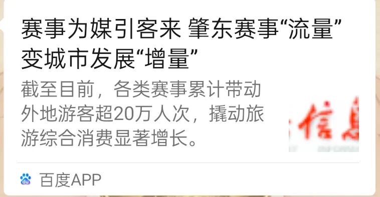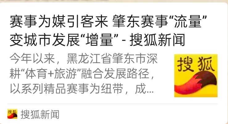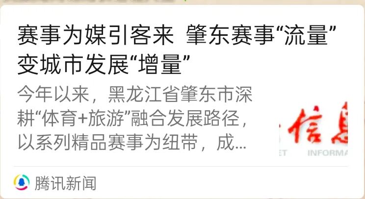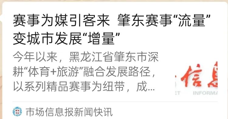 近日,肇東市以系列精品賽事為核心的文體旅融合發(fā)展模式引發(fā)多家媒體集中關(guān)注,今日頭條、騰訊新聞、搜狐新聞、百度、市場信息報信息快訊等多家媒體相繼聚焦其賽事經(jīng)濟成效進(jìn)行專題報道,讓肇東“以賽促游、以游興城”的發(fā)展故事成為矚目焦點,賽事經(jīng)濟成為城市的新名片。