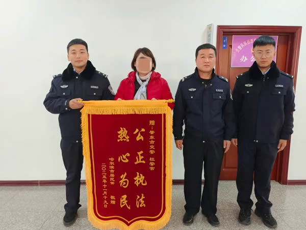 近日,哈市市民黃女士將一面鐫刻著“公正執法、熱心為民”的錦旗送到肇東交管大隊事故中隊民警手中,由衷表達對他們的感謝之情。