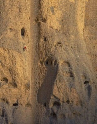 幾十個(gè)洞穴建造在脆弱的沙土崖壁上,看起來(lái)就像是一座古老的城堡。 登山者在探索采萊村附近的一系列洞穴。