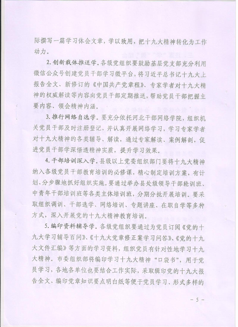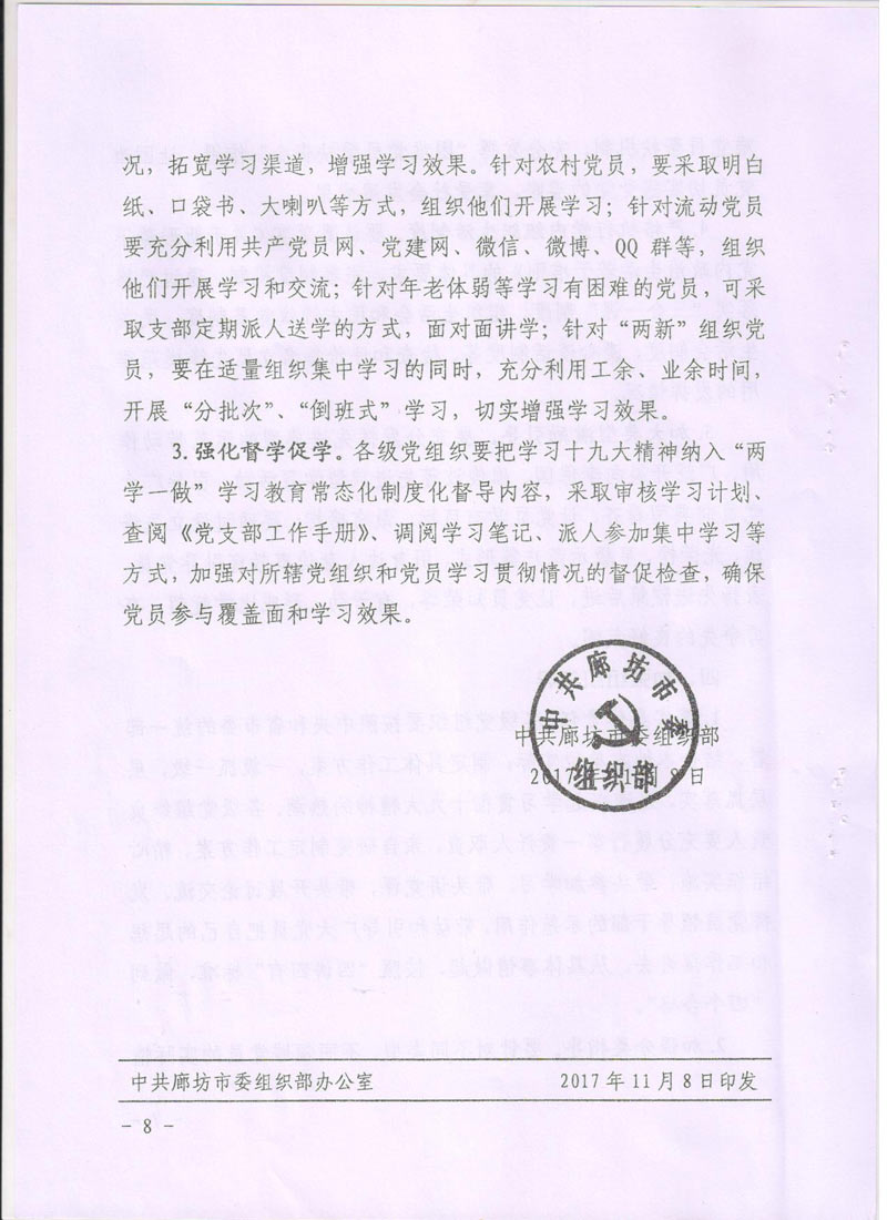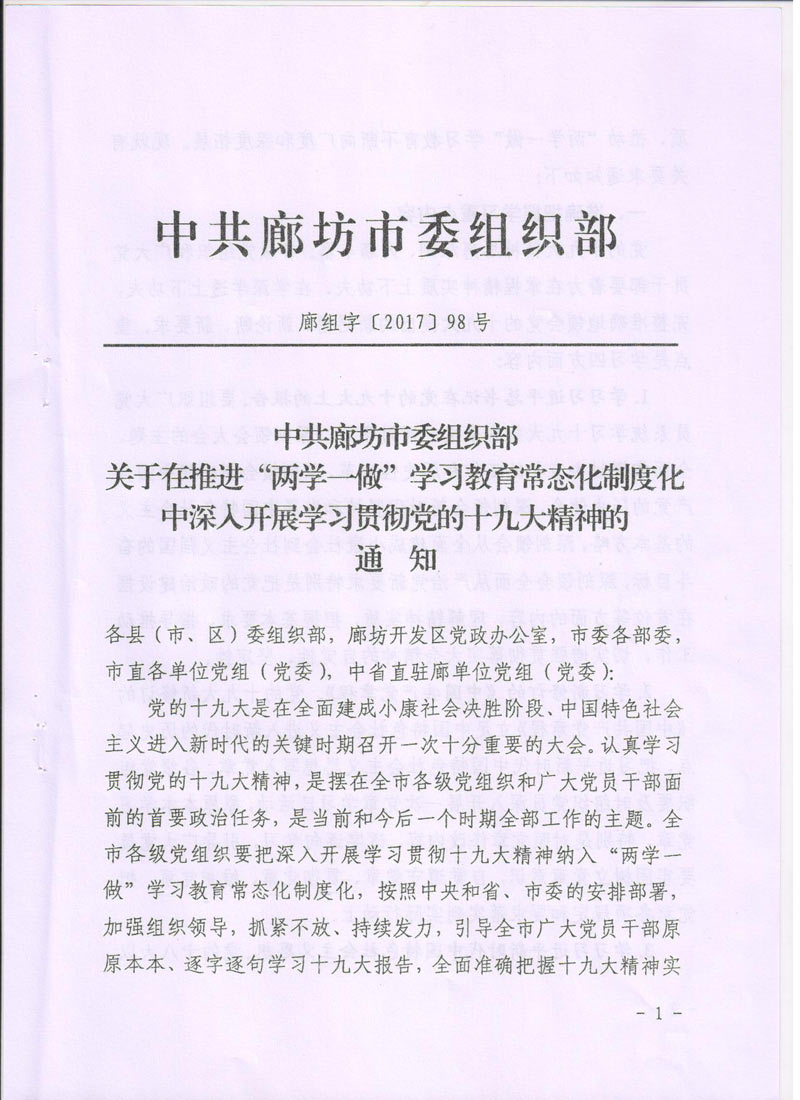 現(xiàn)將中共廊坊市委組織部《關(guān)于在推進“兩學(xué)一做”學(xué)習(xí)教育常態(tài)化制度化中深入開展學(xué)習(xí)貫徹黨的十九大精神的通知》轉(zhuǎn)發(fā)給你們。請認真按照通知要求,緊密聯(lián)系本單位實際,把深入開展學(xué)習(xí)貫徹十九大精神納入“兩學(xué)一做”學(xué)習(xí)教育常態(tài)化制度化,把十九大精神學(xué)深學(xué)透,全面把握十九大精神實質(zhì)。